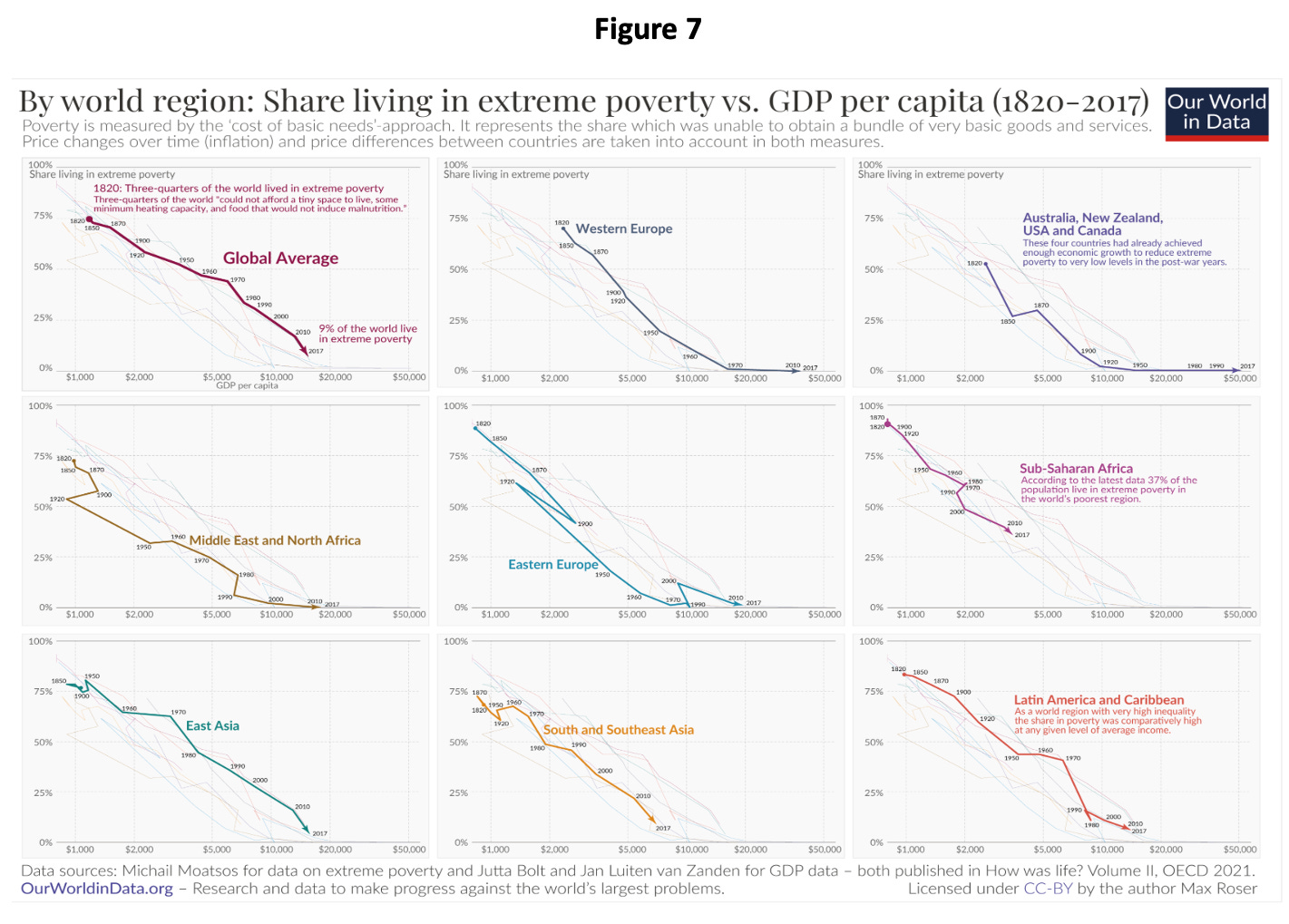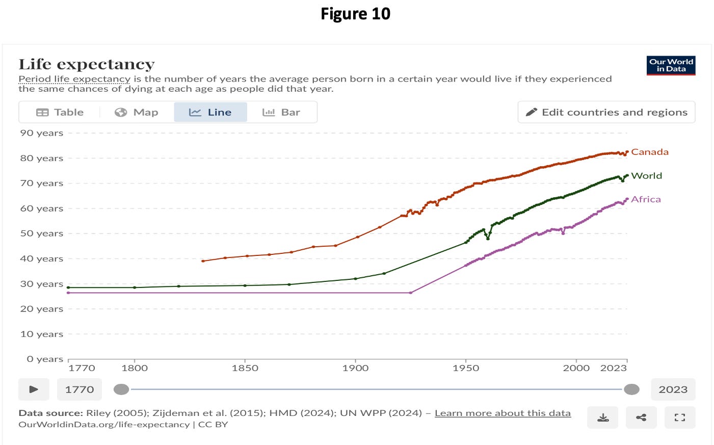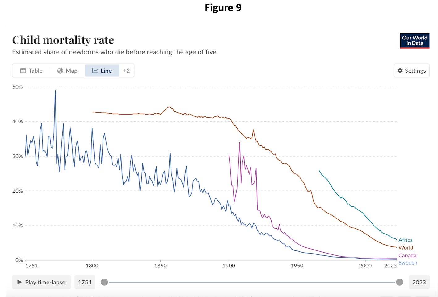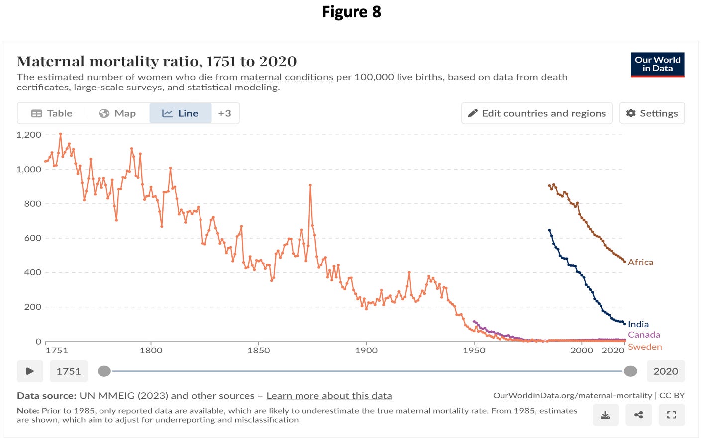 Steady increases in GDP per capita over 200 years, increasingly spread throughout the world, albeit unevenly, would seem to be self-evidently a good thing. But there has always been a current amongst the chattering classes that has decried modernity. Its most recent manifestation is the “Degrowth Movement.” Figures 7-10 below provide a small slice of what economic growth has meant in terms of human wellbeing, both in “rich” countries, and in “developing countries.”