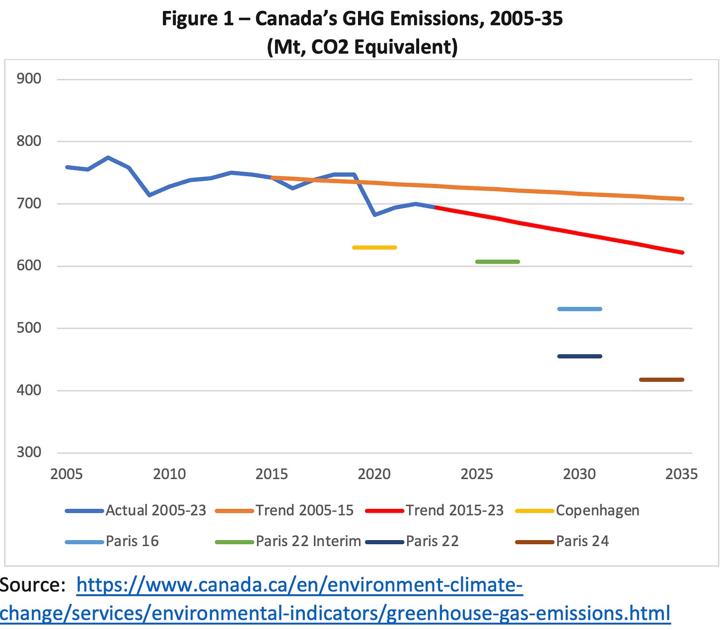 How has Canada fared in living up to these commitments? Figure 1 below provides a take on answering this question. It shows the actual path between 2005-23, projects that path out through 2035 under two scenarios – one is to continue the trend from 2005-15 (the “Harper trend”), the other is to continue the trend from 2015-23 (the “Trudeau trend”). It also shows the targets just listed above.