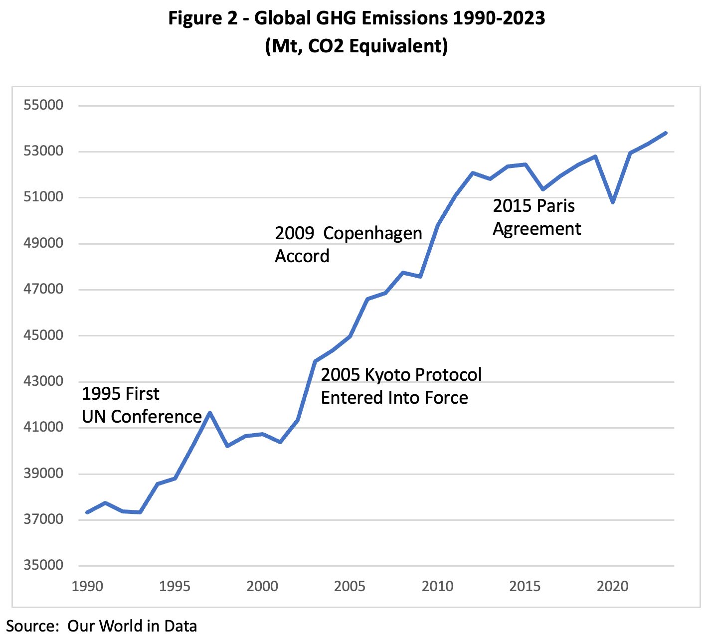 Lest we be too hard on Canada’s performance, it is important to point out that, notwithstanding all of the global climate change efforts of the past 30 years, there is little evidence that the world has begun to bend the emissions curve, as shown in Figure 2 below.