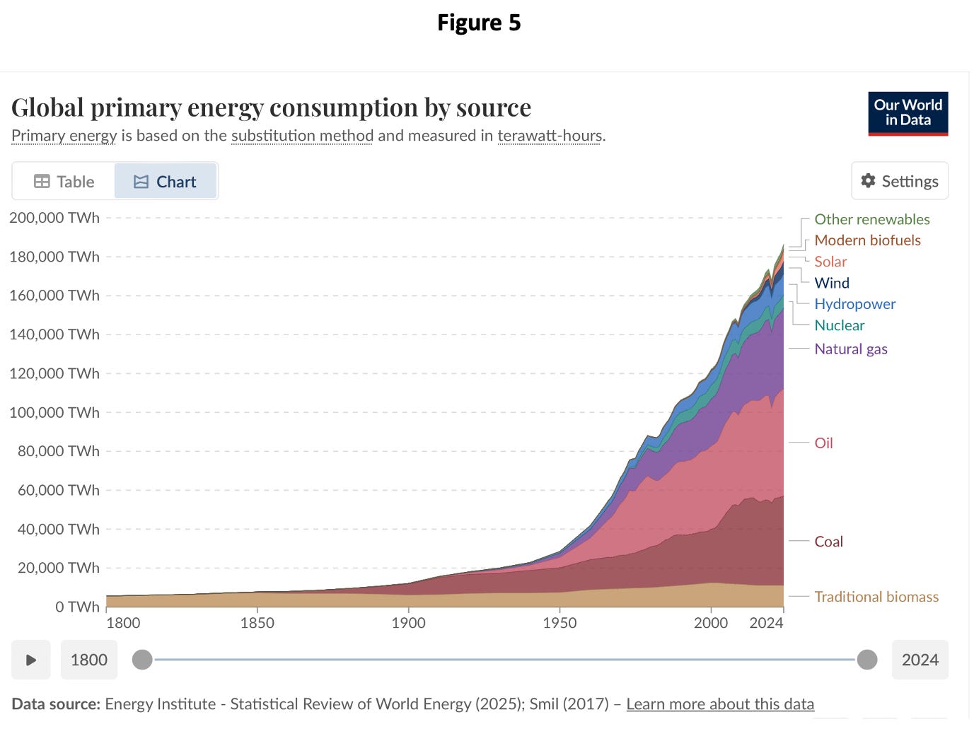 There is another perspective, call it the thermodynamic perspective. To understand what is meant by this, compare Figure 4 with Figure 5 below, which shows the total energy consumed in the world between 1800 and 2024.