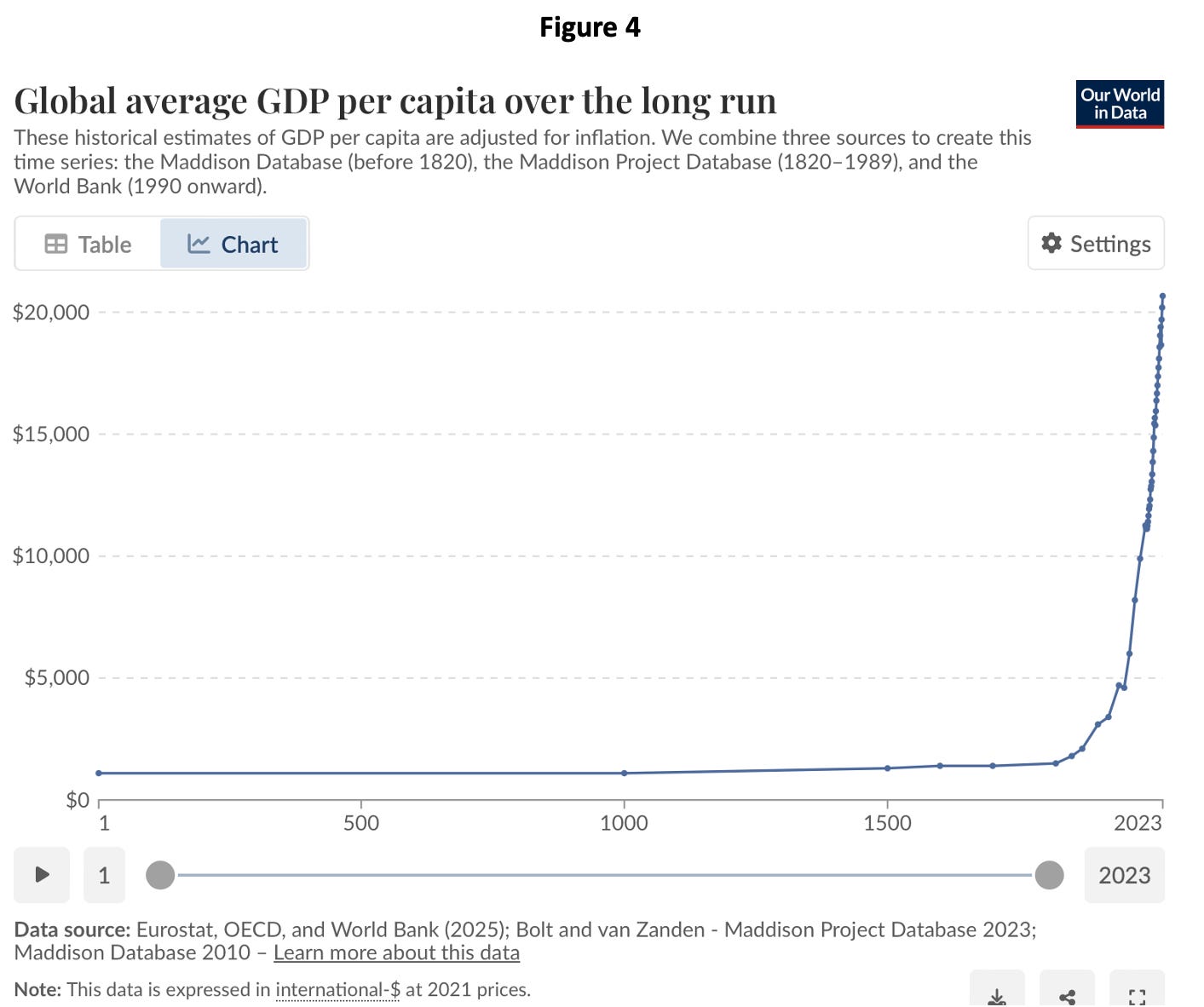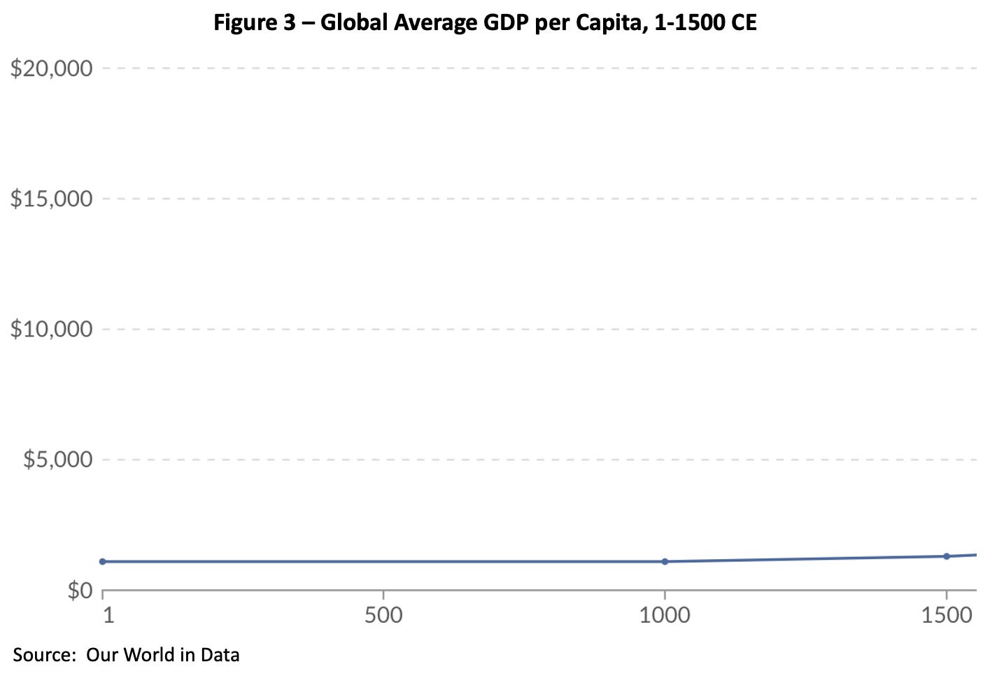 This post will make extensive use of figures from the wonderful site Our World in Data. Figure 3 below is a clip from one of their graphs which shows how world average GDP per capita evolved over the past two thousand years.