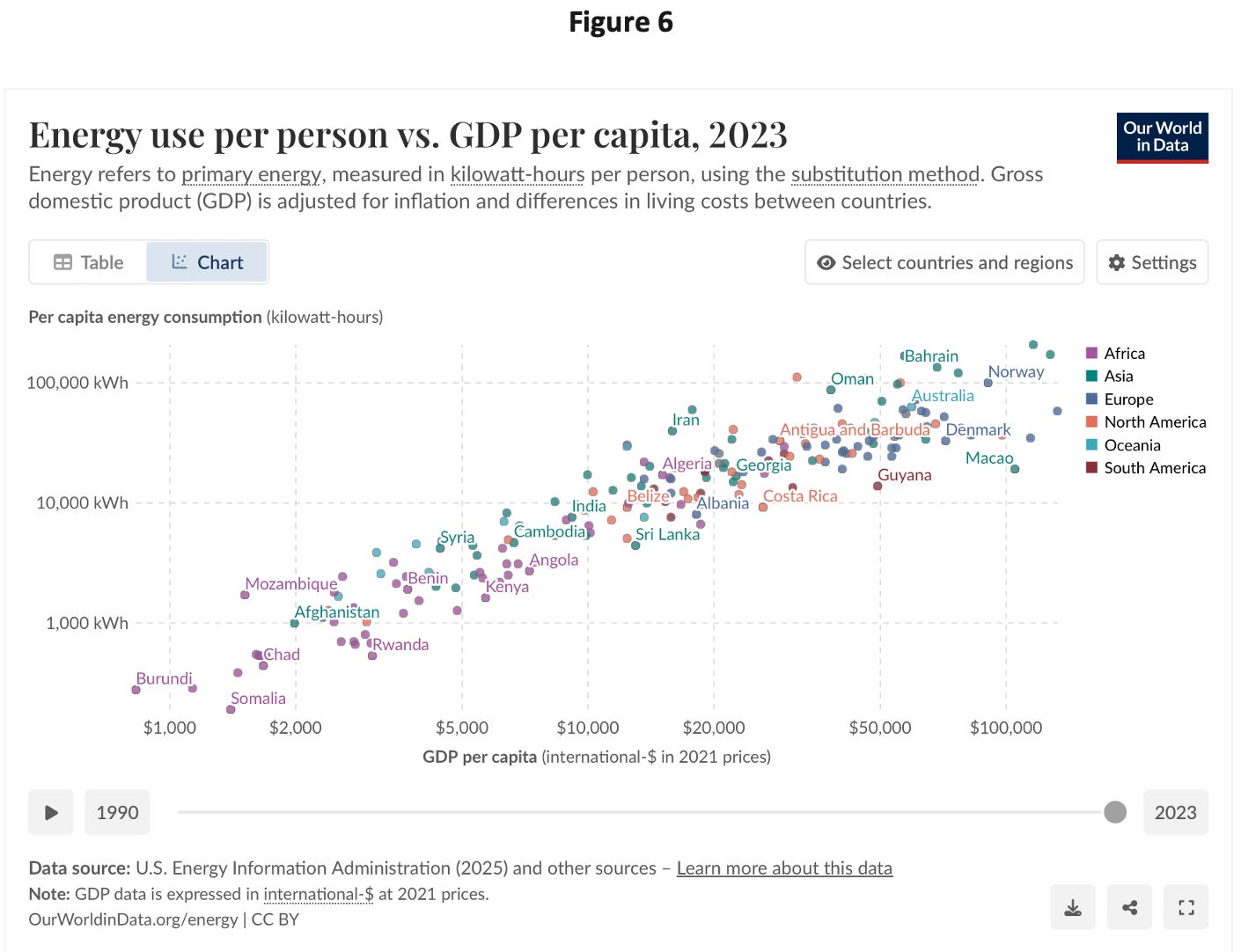 But the key point remains – a higher standard of living has been built on the use of ever more inanimate energy, ever more efficiently. No high energy use, no high standard of living. There are no high-income-low-energy countries. Figure 6 below makes this clear.